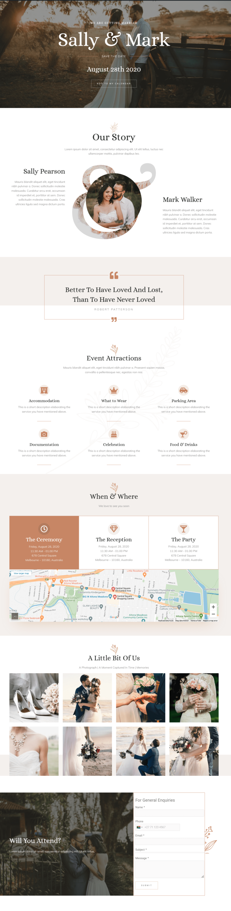 Fully responsive website, Beautiful picture displays, All the info about your wedding day, Venue navigation, Your colour choices, RSVP form, Guesthouse booking form (if apply), Gift choices form (if apply), Frequently asked questions (if apply)